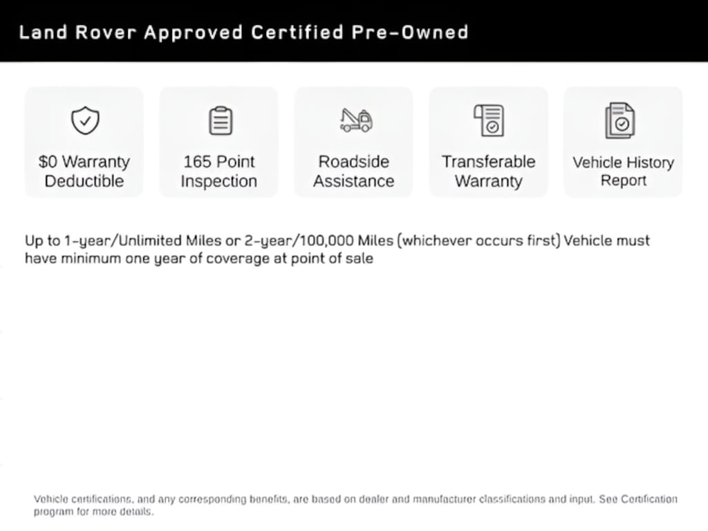 *ACPO Coverage, including limited warranty and roadside assistance, expires one year from the end of the original new car warranty with unlimited miles or two years from the end of the original new car warranty or 100,000 miles, whichever comes first. Original in-service date is the earlier of the new-vehicle retail sale or in-use date, as reported to Jaguar Land Rover North America, LLC. Vehicles can have either a one year/unlimited miles or two years/100,000 miles limited warranty coverage See your authorized Land Rover Retailer for complete terms and conditions.