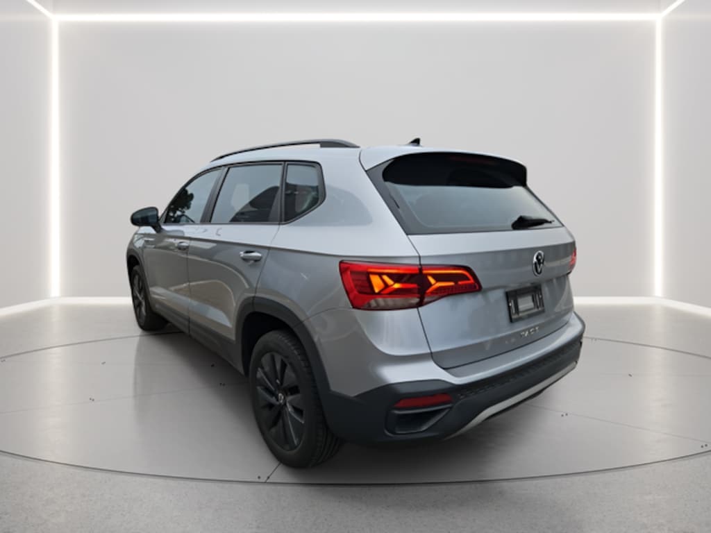 Platinum Gray Metallic 2023 Volkswagen Taos 1.5T S FWD 8-Speed Automatic with Tiptronic 1.5L I4 Turbocharged DOHC 16V LEV3-SULEV30 158hp Clean CARFAX. 3.23 Axle Ratio, 4-Wheel Disc Brakes, 6 Speakers, ABS brakes, Air Conditioning, Alloy wheels, AM/FM radio, Brake assist, Bumpers: body-color, Cloth Seating Surfaces, Compass, Delay-off headlights, Driver door bin, Driver vanity mirror, Dual front impact airbags, Dual front side impact airbags, Electronic Stability Control, Emergency communication system: VW Car-Net Safe & Secure 5-year, Exterior Parking Camera Rear, Front anti-roll bar, Front Bucket Seats, Front Center Armrest, Front reading lights, Front Strut Rear Torsion Beam Suspension, Front wheel independent suspension, Fully automatic headlights, Illuminated entry, Low tire pressure warning, Occupant sensing airbag, Outside temperature display, Overhead airbag, Overhead console, Panic alarm, Passenger door bin, Passenger vanity mirror, Power door mirrors, Power steering, Power windows, Radio data system, Radio: Composition Color AM/FM, Rear anti-roll bar, Rear seat center armrest, Rear window defroster, Rear window wiper, Remote keyless entry, Roof rack: rails only, Speed control, Speed-sensing steering, Split folding rear seat, Spoiler, Steering wheel mounted audio controls, Tachometer, Telescoping steering wheel, Tilt steering wheel, Traction control, Trip computer, Variably intermittent wipers, Wheels: 17" Silver Painted Alloy.